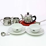 ステンレス製ティーポット一人用(400cc)と英国式ティーセット(オリジナルティーカップ) 価格: 14,990円 レビュー評価: レビュー数: 16年前、ロンドンのニューカレドニアマーケット(蚤の市)の店頭で目に付いた愛嬌のある小さなティーポット。裏面には「Made in Japan」の刻印がありました。経路はわかりませんが流れ流れてロンドンにたどり着いた様でした。●そんなティーポットを復刻させたのがこの商品です。見た目は可愛いティーポットですが、容量はたっぷりティーカップ2杯分。フタと取っ手部分がプラスチック仕様となっており、女性を意識したティーポットとなっています。●ステンレスティーポットは、汚れが落ちやすく、キズがつきにくいのでいつまでも美しい輝きを保つことができます。 熱の伝わり方が高く陶器に比べて早く湯温と食器の温度が同等に |